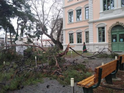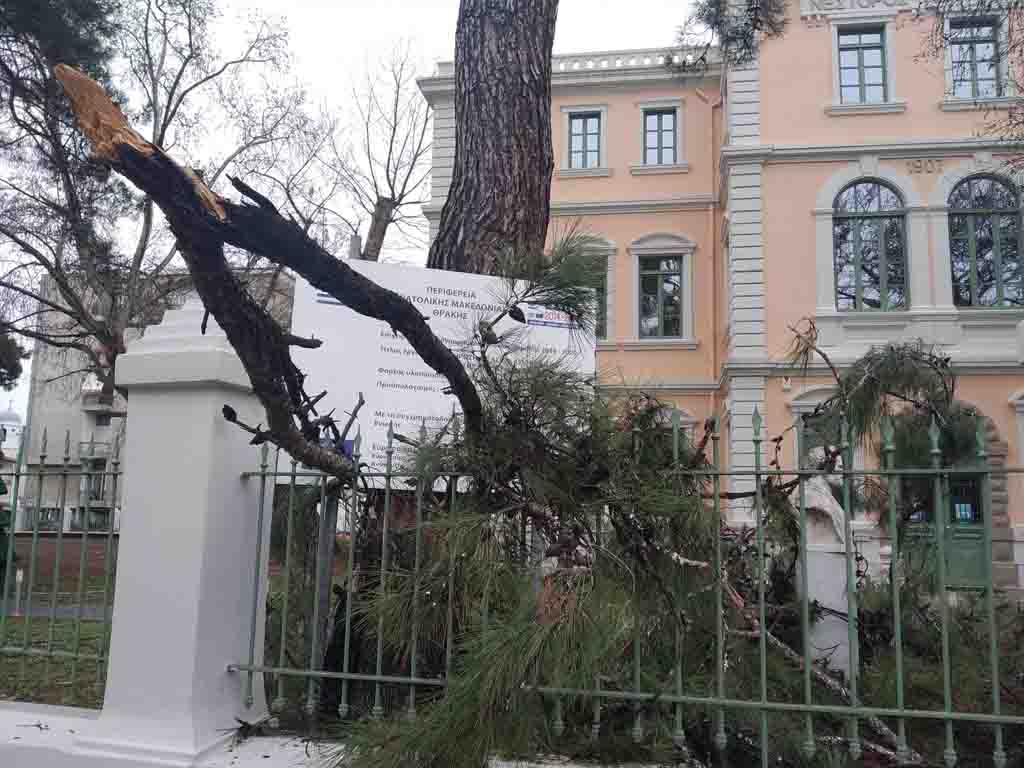 Τεράστια κλαδιά και κορμοί από τα γέρικα πεύκα δεν άντεξαν και έπεσαν στην αυλή της Τσανακλειου. Ευτυχώς το περιστατικό συνέβη σε ώρες αργίας (το πρωινό της Κυριακής 10/1).
